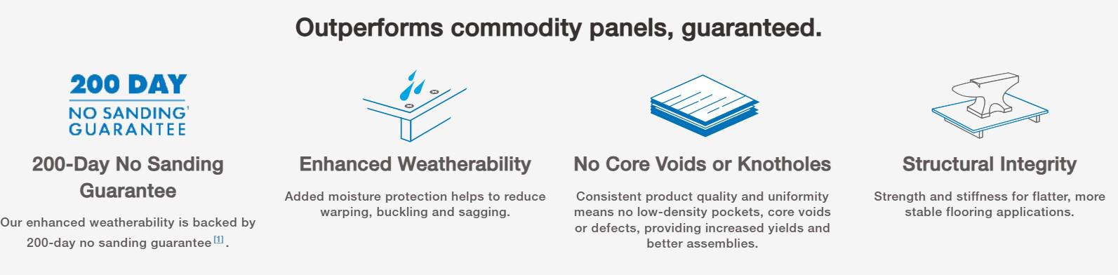Huber Blue Plus OSB flooring is a superior alternative for the builder who uses commodity panels. You can upgrade to a product backed by a no sanding guarantee while offering customers an extended warranty.* See Warranty for details.