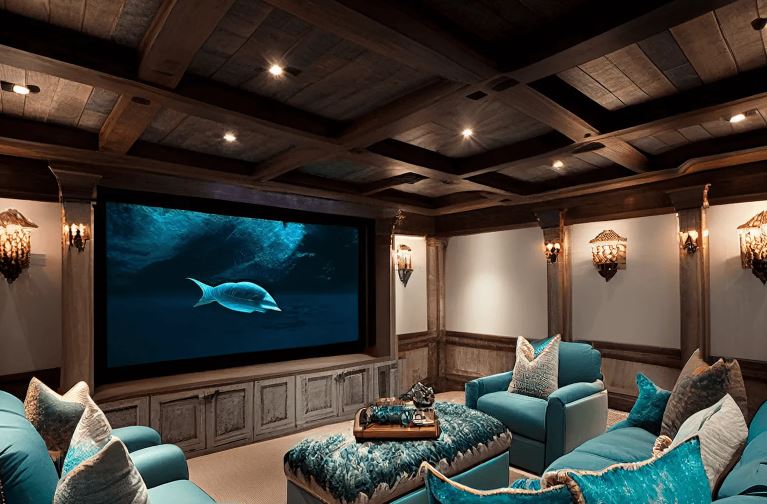 Add a large screen or projector, comfortable seating with leather recliners or distressed sofas, and warm ambient lighting to create an inviting atmosphere reminiscent of a vintage movie house. For an authentic movie experience, consider adding soundproofing materials to the walls and ceiling.