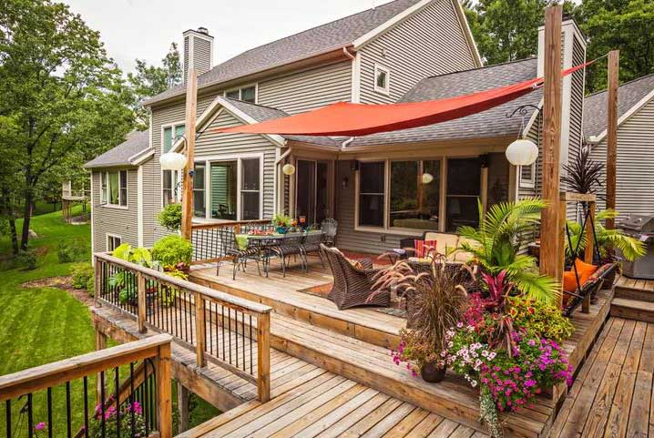 Provide shelter from the sun with a shade sail. Install a fabric canopy above your deck to create a comfortable and shaded area for outdoor dining, lounging, or entertaining. Choose a shade sail in a bold color or pattern to add visual interest and enhance the overall aesthetic of your outdoor space.